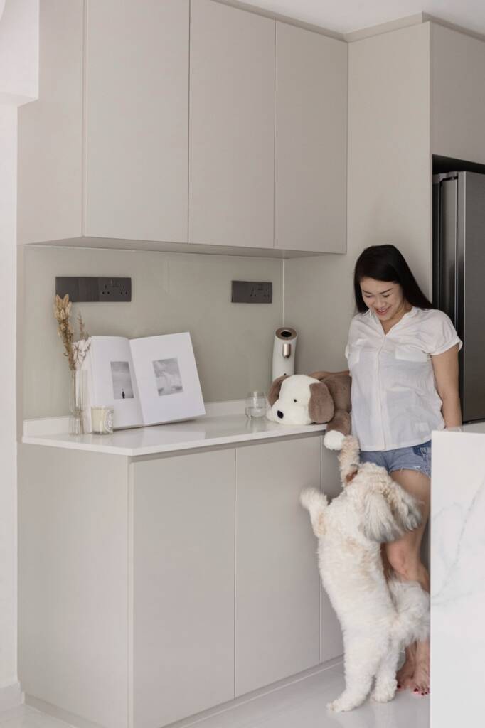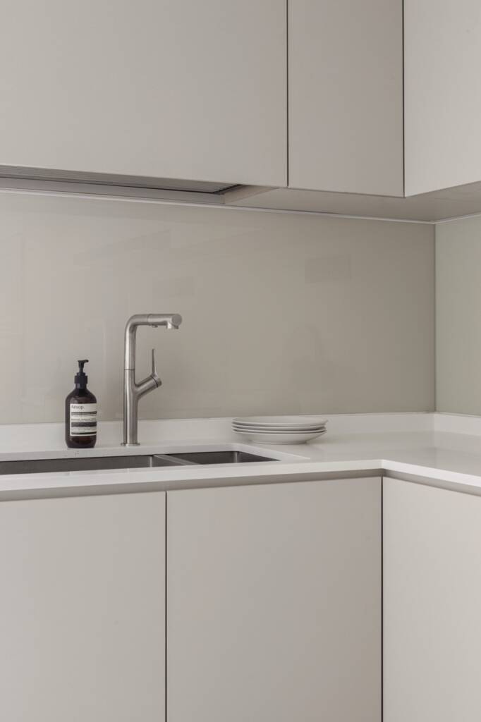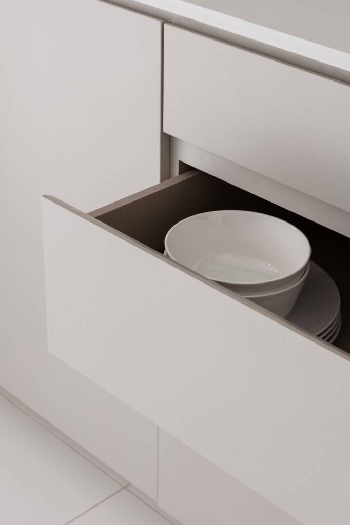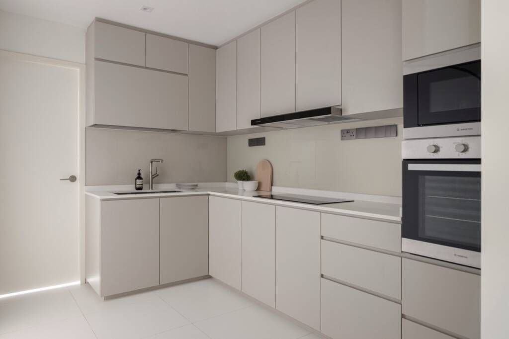 Clean, quiet, and utterly functional—this L-shaped kitchen is a study in modern minimalism. Matte-finished cabinets in a soft taupe seamlessly blend into the neutral interior palette, while handle-less fronts preserve the visual purity of the space. Upper and lower cabinets maximize storage without crowding the room, and built-in appliances are discreetly integrated to maintain the sleek silhouette. Perfect for those who appreciate simplicity, order, and timeless design.