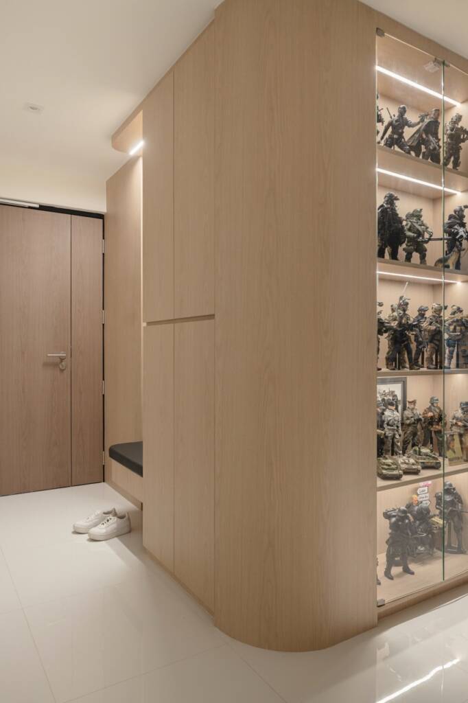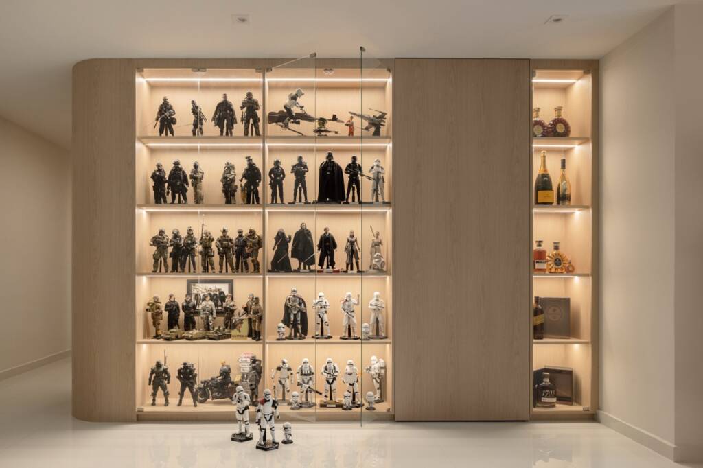 This striking full-height cabinetry is purpose-built for collectors, turning display into a design statement. Framed in warm wood tones and softly lit with recessed LED strips, the open shelves behind glass doors showcase a curated array of figurines and memorabilia with museum-like precision. The right section integrates a tall cabinet with concealed storage and a dedicated liquor display, offering both utility and elegance. It’s a brilliant fusion of passion, organization, and aesthetics… all in one cohesive structure.